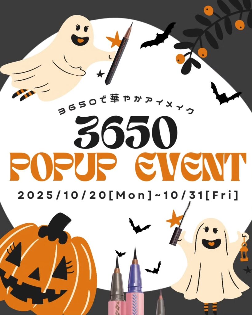 多色展開のアイライナー・マスカラで人気の「3650」が、YodobloomとコラボしたPOPUPイベントを開催。期間中はハロウィンシーズンにぴったりの限定メイク体験「3650華やかポイントメイク」(40分)を実施 (※要予約)。会場では実際にコスメを試せるほか、購入者限定のガチャ企画も実施される。旬のカラーを自由に楽しみたい人におすすめのイベント。
