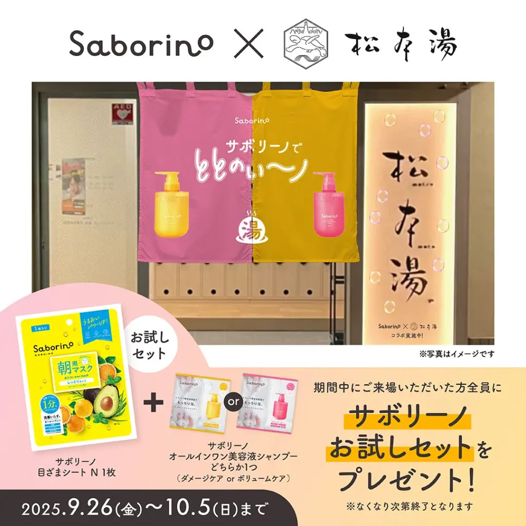 タイパコスメブランド『サボリーノ』と東京都中野区の人気銭湯『松本湯』が初コラボし、2025年9月26日(金)〜10月5日(日)の期間限定イベントを開催。新登場の「サボリーノ オールインワン美容液シャンプー」をお風呂で体験できるほか、入浴後にはシートマスクシリーズも試せる特別な空間。美容もリラックスも同時に叶える、銭湯ならではの“ととのい×タイパ美容”。