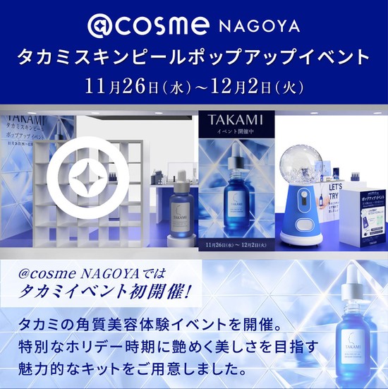 @cosme NAGOYAでタカミの期間限定ポップアップが開催。SNS登録+アンケートで挑戦できるカプセルトイや、キメスコープを使った角質美容体験など、タカミのケアを深く知れる企画が登場。人気のタカミスキンピールはイベント限定で60mLが販売され、購入でマスクが付く特典も実施。さらにスキンピールと美容液・化粧水がセットになった限定キットも販売される。12/1・2のBEAUTY DAY期間はポイント10%バックも実施される注目イベントが開催。